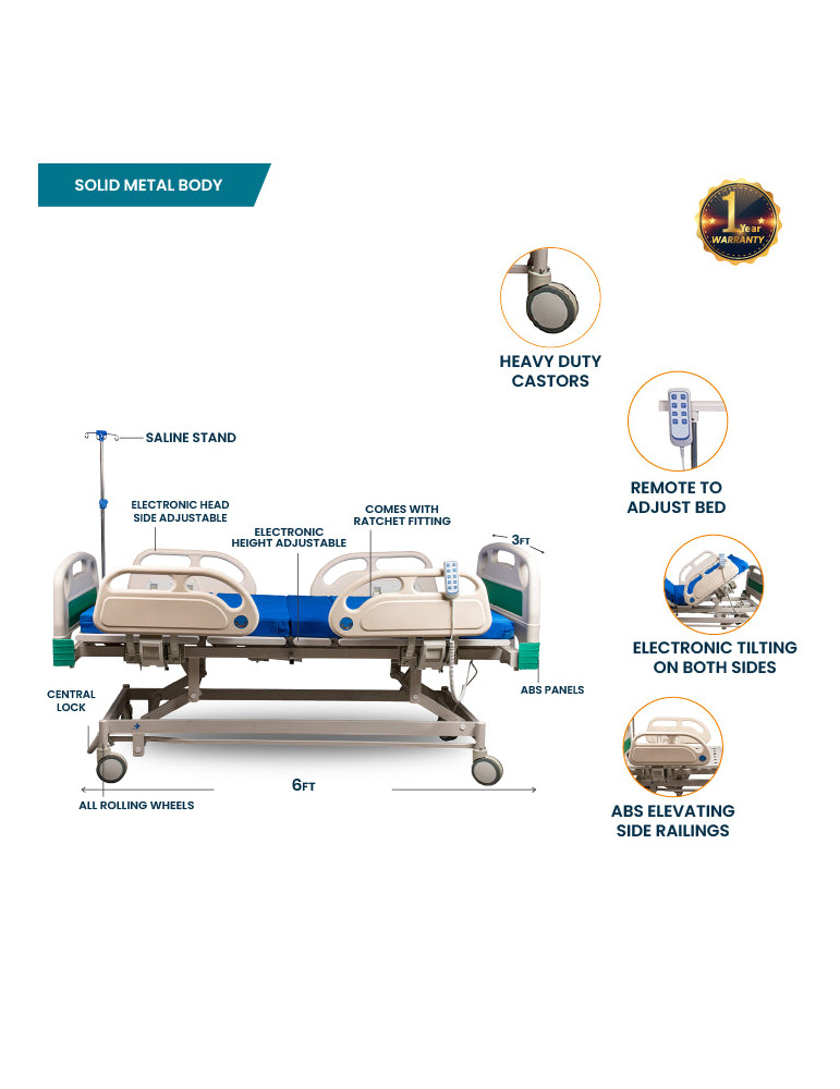 The Arrex Five Function Hospital Bed is a premium electric ICU hospital bed designed to provide maximum comfort, safety, and flexibility for patients requiring long-term medical care. Suitable for home care, nursing homes, and hospitals, this bed supports multiple positioning options to improve patient recovery and caregiver efficiency.
